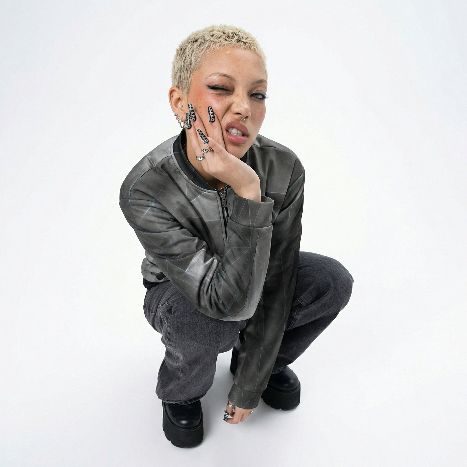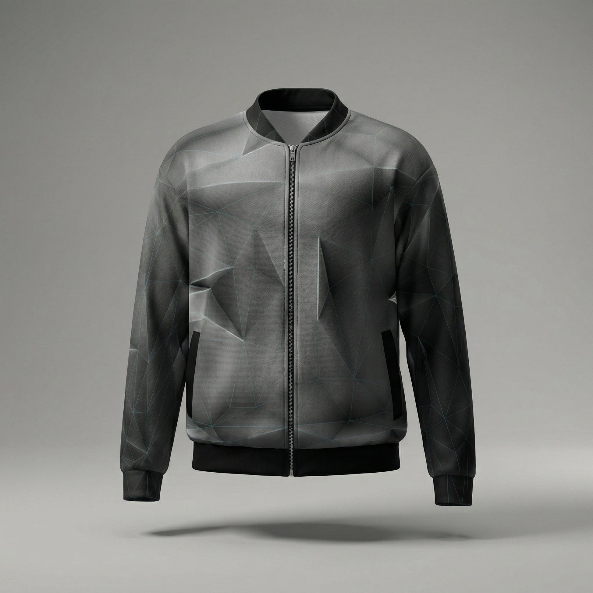 The ANSO Low-Poly Bomber Jacket (Blue Grid System) translates digital geometry into wearable form through restraint and precision. A cool electric Signal Blue grid traces the polygon architecture with controlled contrast — technical, structural, intentional.