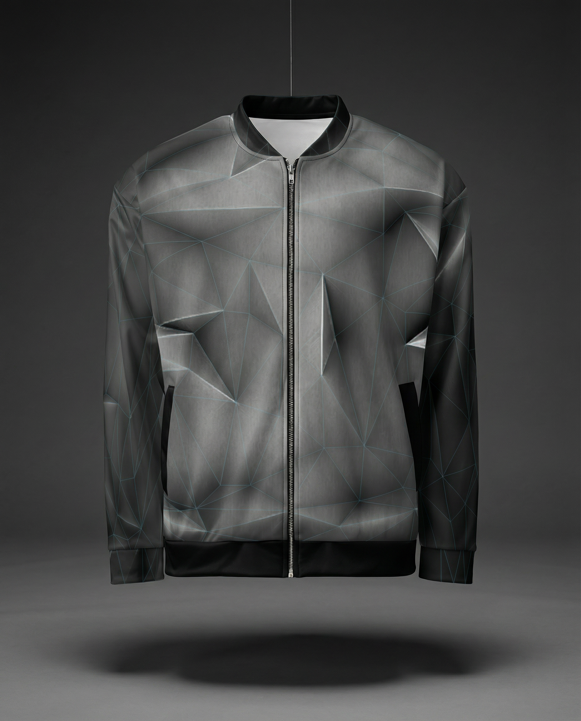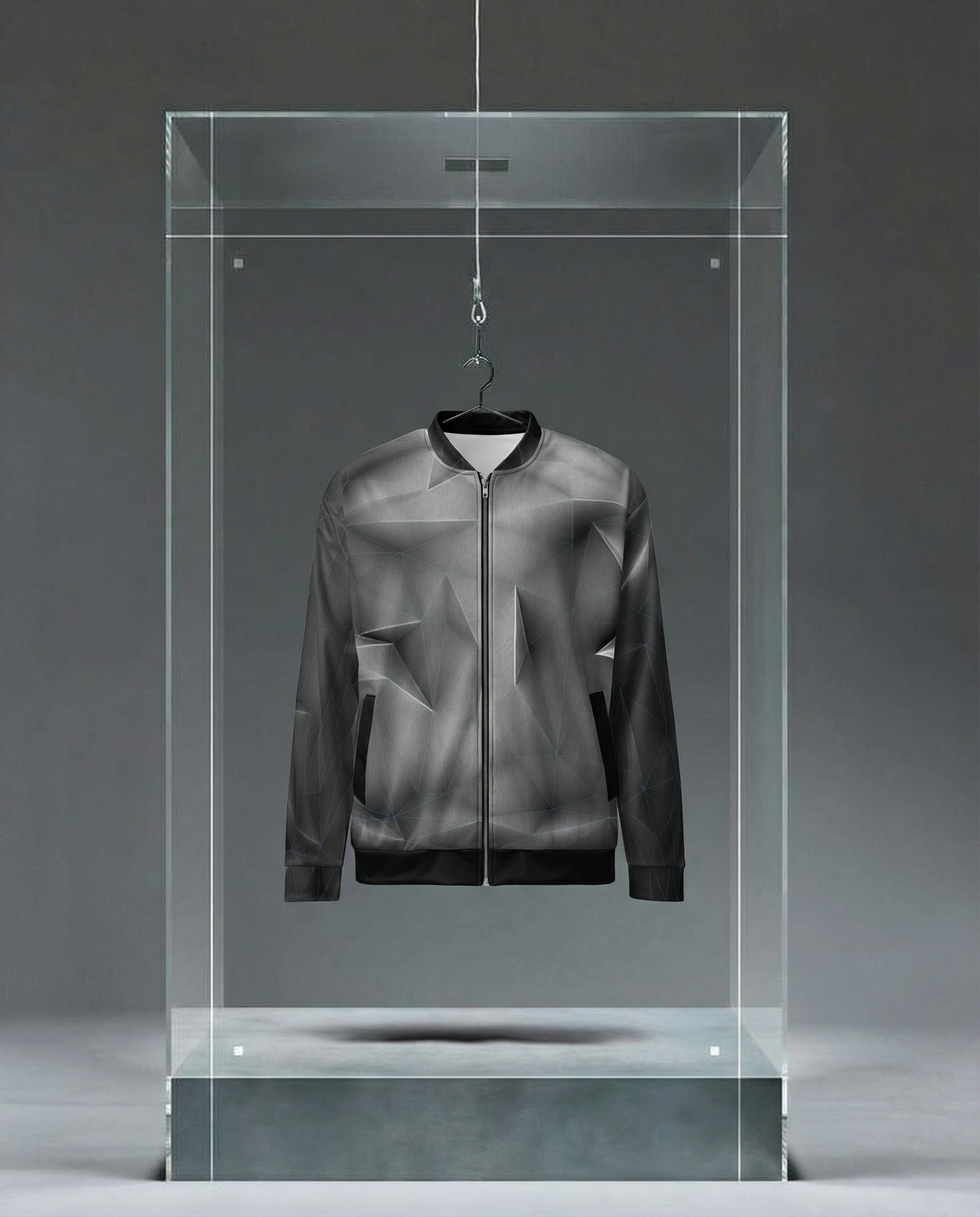 Built from sculpted 3D assets and engineered scene logic, polygon planes wrap the body through flat surfaces, intersections, and deliberate reduction. The grid does not decorate the jacket — it maps it.